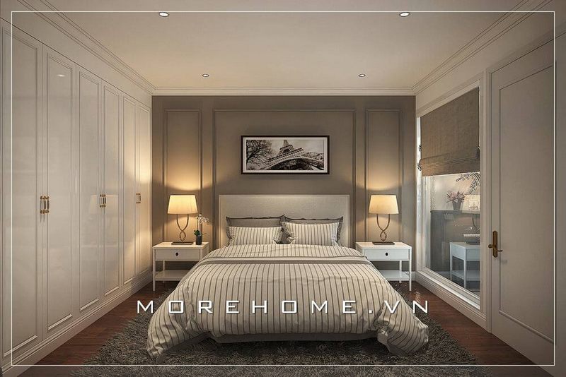 Mẫu thiết kế nội thất hiện đại cho nhà phố cùng với sự sử dụng của tủ quần áo cửa lùa âm tường là giải pháp hàng đầu để giảm thiểu diện tích không gian trong phòng ngủ.