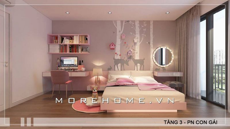 Mẫu bàn học với liền kệ sách và tủ để đồ gỗ công nghiệp hiện đại là một sự lựa chọn tuyệt vời để trang trí phòng ngủ của bé gái dễ thương.